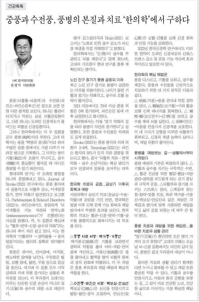 현대의학 연구는 이 오래된 통찰을 하나씩 증명해내고 있다. Journal of Stroke(2023) 연구에서는 중풍 환자에서 공통적으로 뇌혈류 감소, 미세염증 증가, 면역 약화가 발견된다고 보고했다. Parkinsonism & Related Disorders(2022)는 파킨슨에서도 동일하게 <뇌 미세혈관 기능 저하와 면역노화(immunosenescence)>가 진행된다는 사실을 밝혔다. 즉, 두 질환의 핵심에는 “혈류·면역·신경·골수의 약화”라는 하나의 축이 자리 잡고 있다. 이는 한의학의 “기혈허약 → 경락불통 → 풍의 발동”이라는 병리와 정확히 맞아떨어진다.